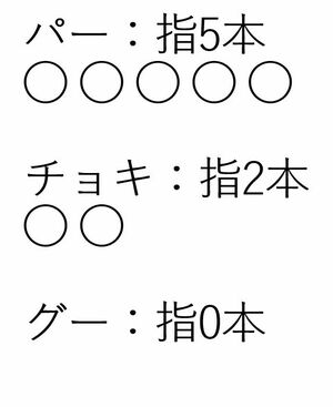 ところで、ジャンケンの手にも、奇数と偶数があります。パーは立っている指が5本、チョキは2本、グーは0本です。パーのみ奇数で、チョキとグーは偶数ですね。