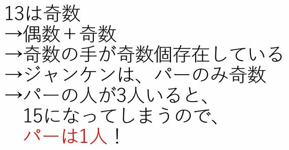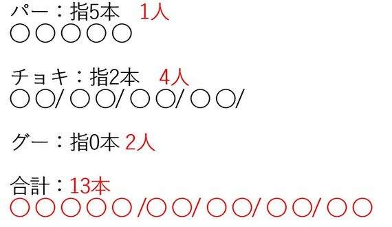 そして、「13-5=8」なので、残りは8本で、グーとチョキによってこの8本は構成されています。当然、グーは0本なので、チョキが4人で8本になっていると考えられます。