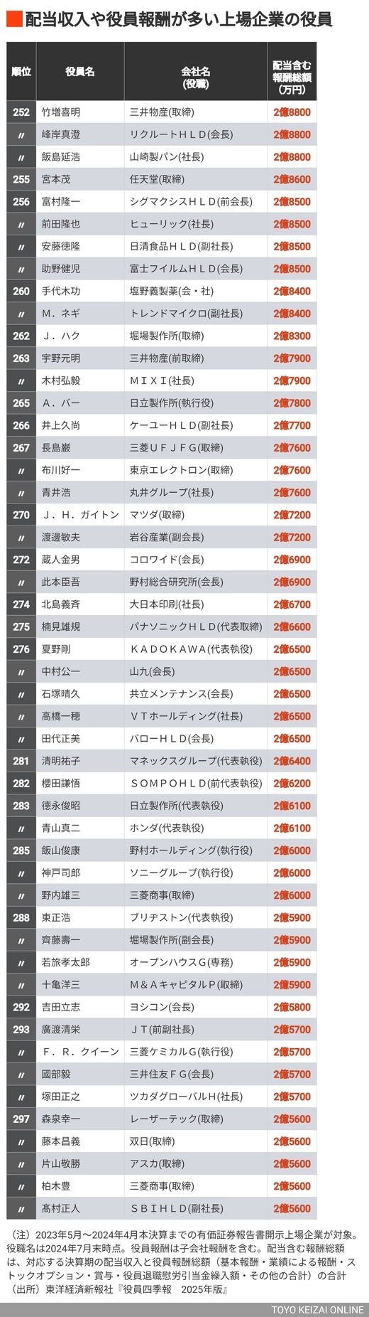 政治・経済・投資 #賃金・生涯給料ランキング 前の記事 次の記事 配当含む「年収1億円超」経営者ランキング500 首位は188億円、トップ10に柳井家から3人ランクイン 2分で読める 公開日時:2024/10/26 05:30 『役員四季報』編集部 フォロー 1/11 PAGES 2/11 PAGES 3/11 PAGES 4/11 PAGES 5/11 PAGES 6/11 PAGES 7/11 PAGES 次は252~297位 次ページが続きます 8/11 PAGES 9/11 PAGES 10/11 PAGES 11/11 PAGES