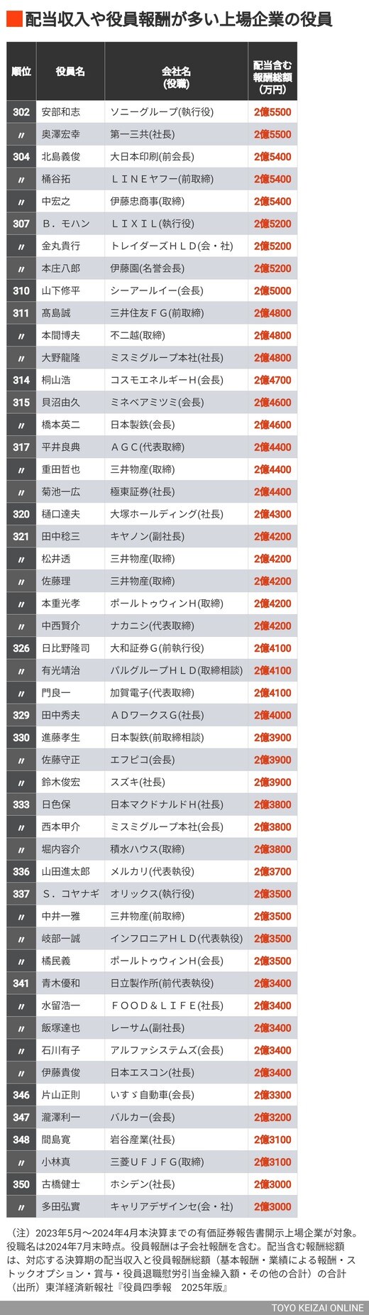 政治・経済・投資 #賃金・生涯給料ランキング 前の記事 次の記事 配当含む「年収1億円超」経営者ランキング500 首位は188億円、トップ10に柳井家から3人ランクイン 2分で読める 公開日時:2024/10/26 05:30 『役員四季報』編集部 フォロー 1/11 PAGES 2/11 PAGES 3/11 PAGES 4/11 PAGES 5/11 PAGES 6/11 PAGES 7/11 PAGES 8/11 PAGES 次は302~350位 次ページが続きます 9/11 PAGES 10/11 PAGES 11/11 PAGES