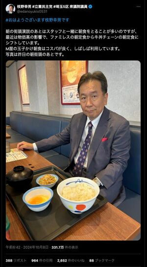 こうした「政治家の食事への批判」は、与党議員に限らない。野党第1党・立憲民主党の元代表である、枝野幸男元官房長官(埼玉5区)のXポストも物議を醸している。ある朝、「最近は物価高の影響で、ファミレスの朝定食から牛丼チェーンの朝定食にシフトした」として、「М屋の玉子かけ朝食」を写真付きで投稿した。