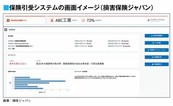 オフィス・工場の構造、施設内の設備や機器、業種、業務内容などリスクは多岐にわたり、引受業務は膨大なデータを読み込んで判断しなければならない。同社はこの作業に際して、データ統合・分析システム「ファウンドリー」を導入、23年から引受申請機能が稼働した。