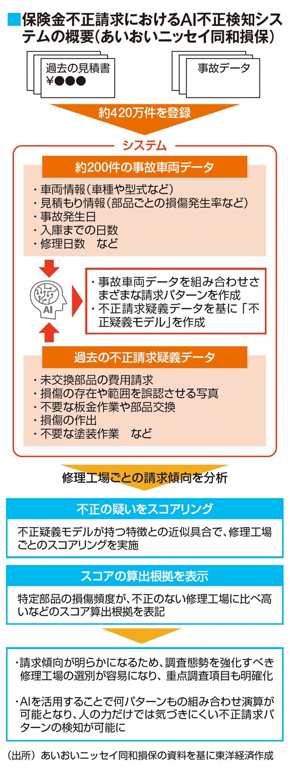 あいおいニッセイ同和損保では昨年、AIを活用した保険金請求の不正検知システムを開発。自動車修理費の不正請求撲滅に乗り出している。過去の保険金請求見積書や事故データ約420万件を登録し、AIに学習させる。約200の事故車両データを組み合わせて、さまざまな請求パターンを作成させる一方、過去の不正請求疑義データを基に不正疑義モデルを作った。
