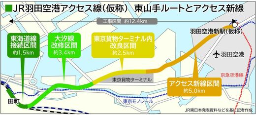 東山手ルートは、田町駅付近で東海道本線と1998年以来休止中の貨物線「大汐線」を接続し、東京貨物ターミナル付近でアクセス新線に乗り入れて東京駅方面と羽田空港を直結する。開業すれば東京駅と羽田空港間が約18分でダイレクトに結ばれるほか、宇都宮線・高崎線・常磐線方面からの所要時間短縮や乗り換え解消なども期待される。