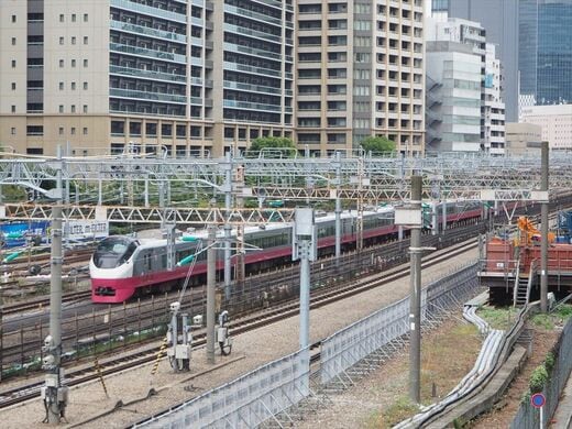 田町駅付近は西側から順に京浜東北線北行(大宮方面)、山手線内回り・外回り、京浜東北線南行(大船方面)、東海道本線上り・下りの計6線、そして東海道新幹線が並んでいる。