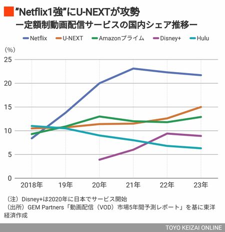 国内の動画配信サービス市場でシェア2位の「U-NEXT」が会員数を大幅に伸ばし、首位のNetflix(ネットフリックス)を猛追している。
