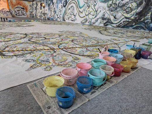 色ごとにバケツを用意。空間を思う存分広く使えるのが、廃校での創作活動の大きな魅力である(写真:著者撮影)