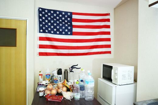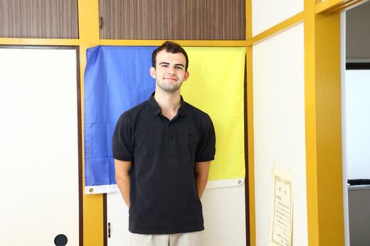 マックスさんの部屋には3つの国旗がある「この部屋にきて、すぐにウクライナの国旗を飾ろうと思いました。あとは今の自分の生活を支えてくれている日本の国旗。アメリカの国旗はインスピレーションがひらめいて、その時一緒に買ったもの。アメリカにも興味があります」(撮影:ヒダキトモコ)