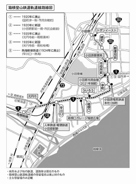 その後、戦時下での一時的な運転休止などがあったものの、軌道線は最後まで「収益は好調」(『箱根登山鉄道のあゆみ』)だった。しかし、戦後の自動車交通量の増大による道路改修を機に、1956年5月31日を最後に廃止された。