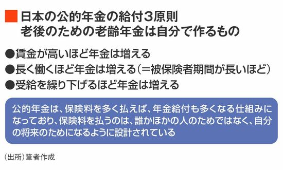 ここに私が公的年金の給付原則と呼んでいる3原則を示していますが、年金は、保険料を多く払えば、自分の年金も多くなる仕組みになっており、保険料を払うのは、誰か他の人のためではなく、自分の将来のためになるように設計されています。