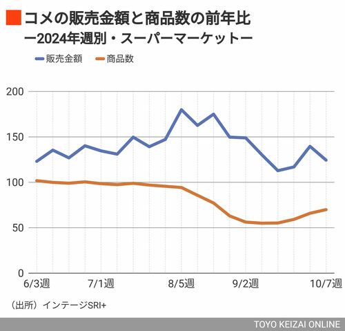 足元の品薄状況を確認するため、全国約6000店舗の販売動向を追っている「インテージSRI+」から、スーパーマーケットにおけるコメの販売金額と商品数の前年比を見てみたい。