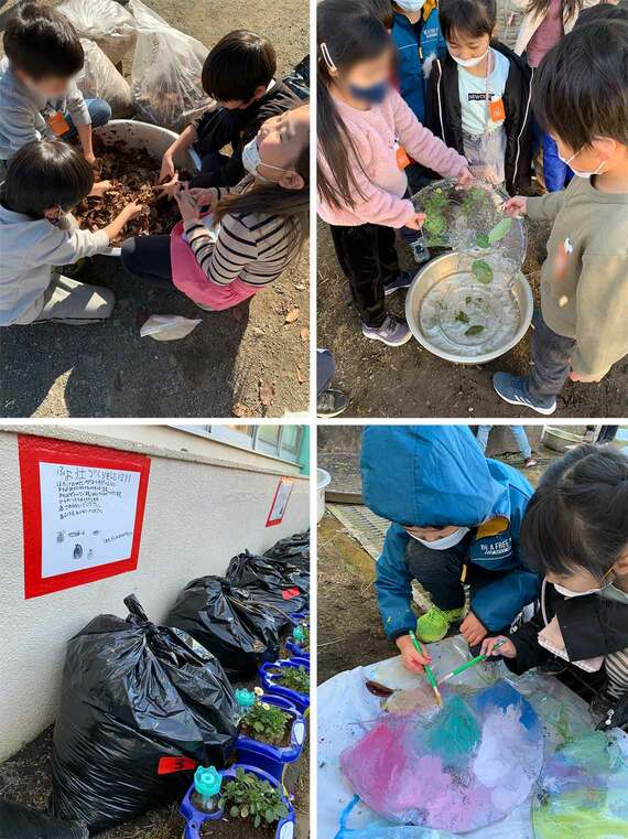 春の花を栽培するために「香川の森」にある土を植木鉢に入れる際、子どもたちから出た「落ち葉もいっしょに入っちゃうけどいいの?」という質問に「葉っぱは土になるから大丈夫だよ」と答え、「落ち葉が土になるか、実験してみる?」と提案。子どもたちから「うん、やるやる!」と声があがり、「腐葉土プロジェクト」に取り組みました。