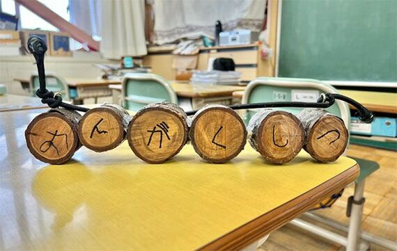 「教室表示をつくる」というモチベーションがあるため、子どもたちがひらがな学習に向かう姿勢は真剣そのものでした。特別教室の名前の語尾に「室」(しつ)がついていることに気づいた子どもたちからの提案で、ひらがな学習は「し」「つ」から始まりました。「教室表示プロジェクト」は、前期は「生活科」と「国語科」のひらがな学習、後期は算数科も加わり、子どもたちが切った木の数を数える活動を通して「20よりも大きい数の学習」を行いました。