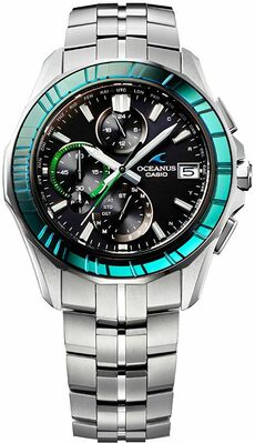 12面カットのベゼルが特徴のクラシックライン『OCW-T6000SG-2AJR』は、文字板にブルーグリーン蒸着を施した1本。ベゼル上には都市コードが刻まれ、スポーティーさを演出する。