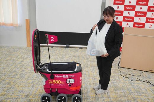 赤い小型ロボットが歩道を速歩きの速度で進む。横断歩道に差し掛かると一時停止し、信号を確認して歩行者と同じように横断する。楽天グループが11月6日に東京都内で開始した無人配送サービス「楽天無人配送」の風景だ。