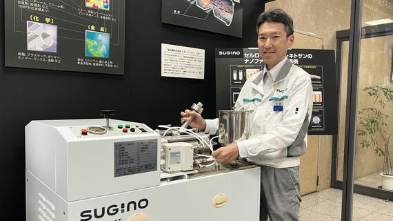 微粒化装置と杉野副社長。水に混ぜた原料同士を超高速でぶつけ合い、粒径ナノメートルサイズまで細かくできる(写真:スギノマシン)