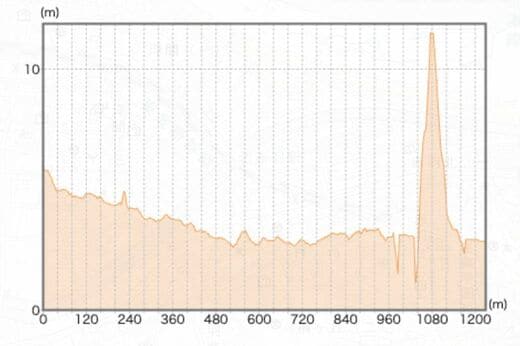 これは、JR赤羽駅から岩淵水門までの海抜の断面を図式化したものだ。左端が赤羽駅で、右端が水門の付近だ。左から右に向かって、なだらかに海抜が下がっているのがわかる。