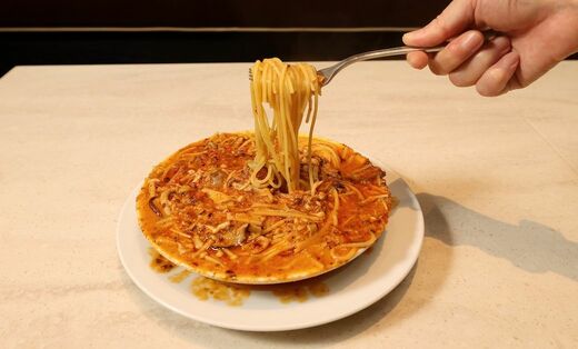 看板メニューの「絶望のスパゲッティ」を試食。驚いたのが、運ばれてきた皿がまだぐつぐつしていたことだ。また顔を寄せなくてもニンニクの香りが押し寄せてくる。皿の縁までいっぱいにスープが入っており、見た目から圧倒されてしまう。