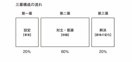 大ストーリーを考える時、参考にしたいのが演劇の脚本を作る時などによく用いられる基本構造「三幕構成」だ。劇の全体の内容を3つに分けて、それぞれに次のような役割をつけるのだ。