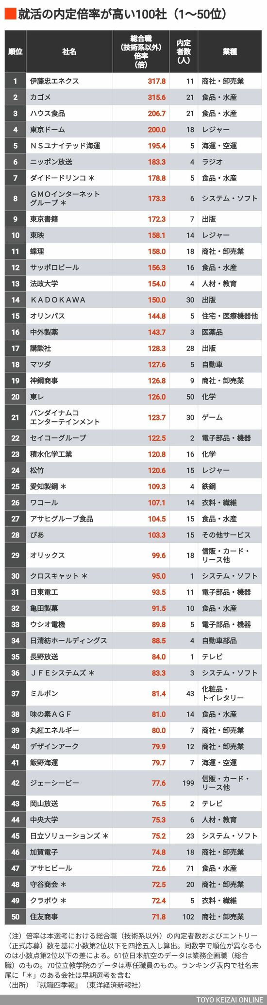 キャリア・教育 #就職四季報プラスワン 前の記事 次の記事 「就活で内定競争倍率が高い」100社ランキング "売り手市場"の新卒就活で応募殺到の企業は? 3分で読める 公開日時:2024/11/27 05:30 丹羽 夏海 東洋経済『就職四季報』編集部 フォロー 1/3 PAGES 2/3 PAGES 1~50位 次ページが続きます:【続いて51~100位】 3/3 PAGES