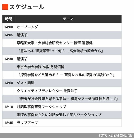 今回のイベントでは、高大接続や高等教育が専門の早稲田大学・大学総合研究センターの遠藤健講師、全国の中高における探究学習の支援実践を通して中高生による政策提言や学会発表などを行ってきた東京大学大学院情報学環の開沼博准教授が講演する。