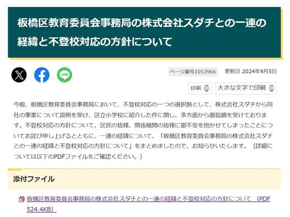 板橋区は9月5日に区HPでスダチとの一連の経緯と不登校対応の方針について公表