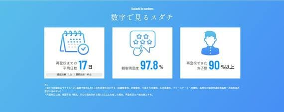これまでのスダチのHPやプレスリリース、代表の小川涼太郎氏の著書などを見てみると、まず同社は「不登校に悩むご家族やお子様にとって『再登校を目指す』という選択肢を当たり前にすること」を目標に掲げてきた。実際に2020年7月にサービスを始めてから、1300人以上の子どもが再登校を実現しており、支援開始から再登校までの日数は平均17日、再登校できた子どもは90%以上に達するという。