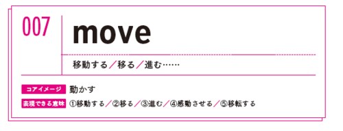 moveは「動かす」を基本のイメージとして、「移動する」「移る」「進む」など、いろんな意味に使えます。多くの場合、物事が前に動いていく状態を示すときに使われます。「感動させる」など、動かす対象がものではなく人の心の場合でも、moveで表現できます。
