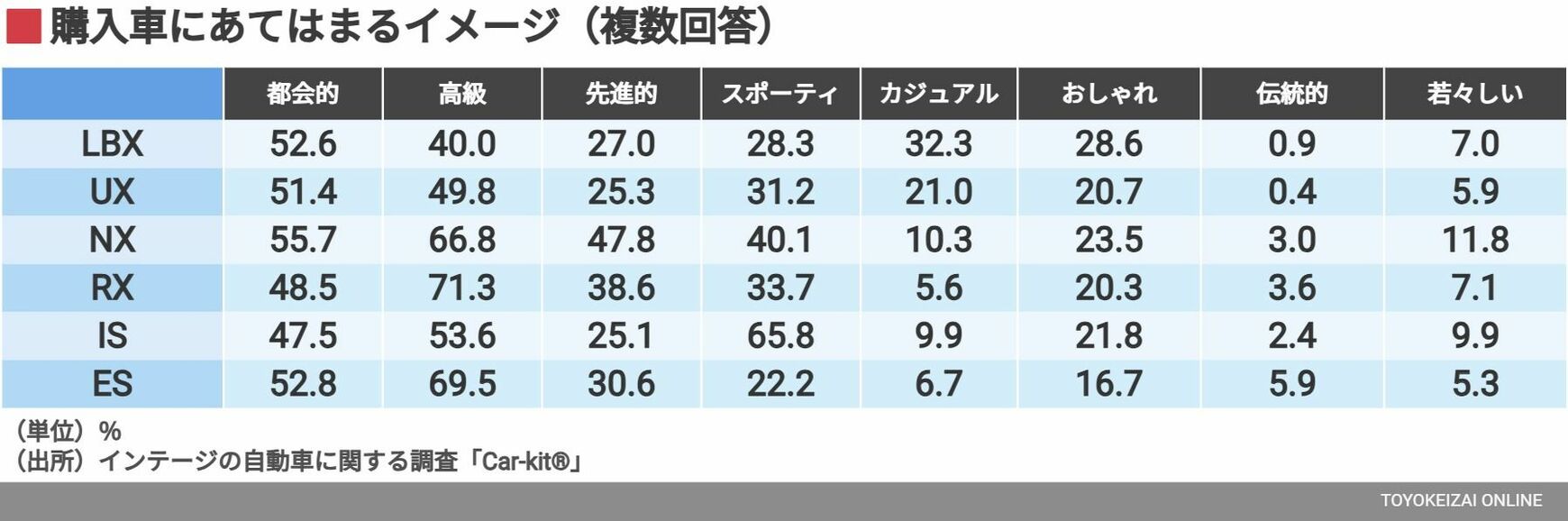 6車種の中で特徴的なのは、LBXだった。コンパクトで400万円台~とサイズ・価格ともに手ごろなクルマで、「高級」のイメージが他モデルより低い中、「カジュアル」「おしゃれ」のスコアをしっかりと獲得している。