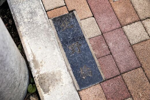よく見ると、道に「北野橋」という表示板が埋め込まれているが、橋らしきものは見当たらない。「あっ、まさか」。僕自身が言葉を発しようとしたそのとき、小林さんが言った。「もうお気づきかもしれませんが、かつて駐輪場のところに川が流れていて、ここに橋があったんです」。