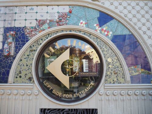周囲を歩いて建物を眺めると、顔や身体の彫刻、鮮やかなタイル、鍛造のオブジェが次々と目に入る。タイルや彫刻には絵が描かれ、建物全体が大きな表現の場のように感じられる。