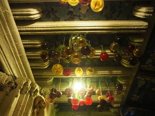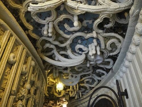 薄暗く静かな空間。天井や壁、足元にはさまざまなエレメントが配置され、中に進むほど装飾の濃度が高くなる。ふと見上げると、天井の不思議な彫刻が目に入る。振り向くと、違った光景が見えてくる。上下・左右・前後から建物が迫ってくる不思議な感覚を抱きながら、秘密の場所へと誘われる。