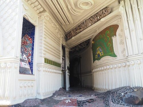 入り口の壁はコンクリート彫刻で、緑や黄色、青、茶色のタイルがあしらわれ、異国の雰囲気が漂う。視線を落とすとタイルの床があり、凸凹してうねっている。