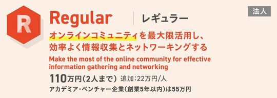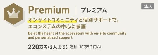 法人向けのプランとして、プレミアム、レギュラーの2つがある。湘南アイパークのオンサイトへのアクセスが可能で、施設のコワーキングスペースやオンサイトイベントを利用できるのが、プレミアムプランだ。レギュラープランは遠方の企業や団体に適したプランで、オンラインコミュニティを中心に、メンバーシップ限定のイベントへの参加はもちろん、個別のコンサルティングサービスを受けることができる。