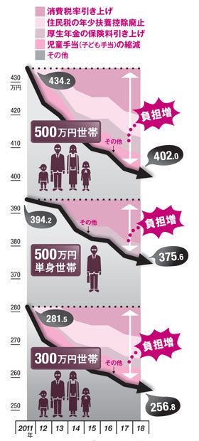 年収500万円の単身世帯の2011年時点の実質可処分所得は394.2万円。同じ年収の片働きの子育て世帯に比べて約40万円少ない。単身世帯には配偶者控除などが適用されないからだ。