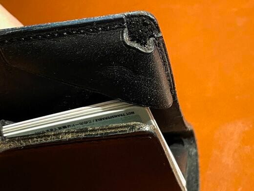 それは、二つ折り財布のカード入れの端に切れ込みをいれて、折り畳んだ財布の端をカードに引っ掛けて留めるという方法です。ぜひ写真を参考にして頂きたいのですが、この方法だと財布の表面に全く出っ張りが生じません。