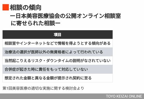 ――厚生労働省の美容医療の適切な実施に関する検討会でも、問題になっています。本来は医師の診察を受けて、自分に合った治療法やリスク、ダウンタイム(施術後の腫れなどが元に戻るまでの時間)、費用について説明を受け、合意を得てから治療を受けるべきですが、そうではないところもあるようです。