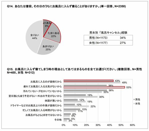 リンナイの調査によると、お風呂に入らず寝てしまう「風呂キャンセル」の経験がある(よくある+たまにある)のは、30%(男性34%、女性27%)。意外に多い印象を受けたが、その理由を聞くと、「お風呂に入るのが面倒だから」、「疲れてお風呂に入る元気がないから」が主な理由だった。