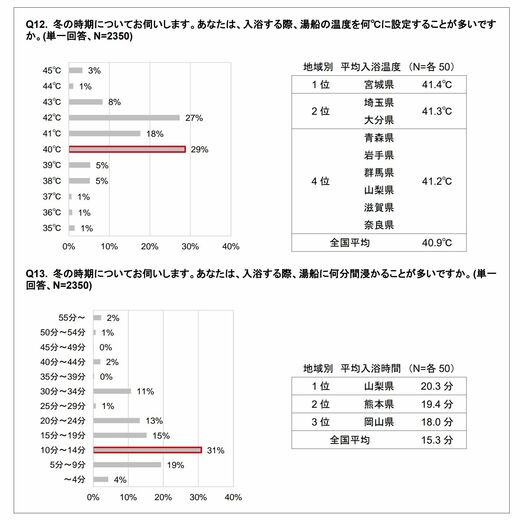 実際に、「冬の時期の入浴はどのようにしているのか」聞いた結果を見よう。まず、入浴時の湯船の温度設定については、全国平均で40.9℃。最多は「40℃」の29%で、次いで「42℃」の27%だった。次に、入浴時に湯船に浸かる時間については、全国平均で15.3分。最多は「10分~14分」の31%だった。