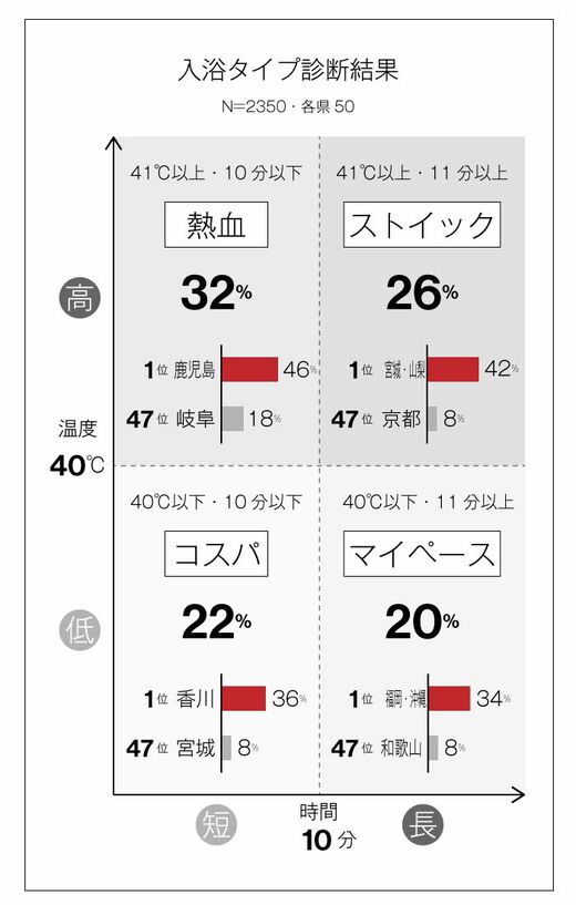 湯船の温度と入浴時間を軸に分類すると、4つのタイプに分かれる。早坂先生はそれぞれの入浴タイプを次のように診断している。