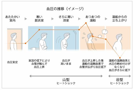 脱衣所や浴室などの寒い場所では血管が収縮して血圧が上昇し、42℃以上の熱い湯に浸かると熱さでさらに血管が収縮して血圧が上昇する。その後、身体が温度に慣れてくると血管が広がり急に血圧が下がり、この血圧の乱高下で起きるのが「山型」だ。