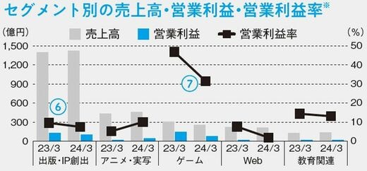 これについて同社の決算説明資料では、「出版・IP創出における原価高、人材投資、ゲームにおける減収影響」などを理由として挙げています。詳細を知るために、セグメント別の業績を調べてみましょう(→下グラフ)。