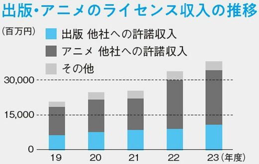 また、人気ライトノベルを原作として、アニメ、ゲーム、グッズと水平展開することで得られるライセンス収入も年々拡大、収益の柱となっています(→下グラフ)。