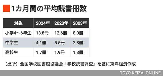 ただ昨年、2023年と比べると、小学生が12.6冊から13.8冊と増加している一方で、中学生は5.5冊から4.1冊、高校生は1.9冊から1.7冊へと減少している。