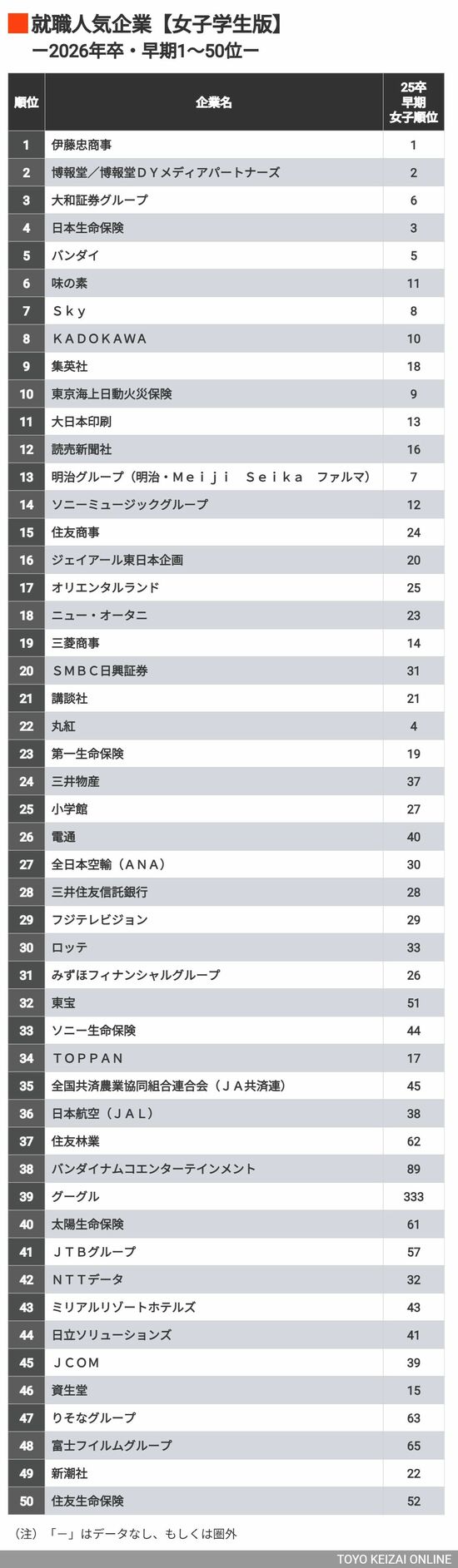 キャリア・教育 #就職四季報プラスワン 前の記事 次の記事 男子・女子学生が選んだ「就職人気ランキング」 「男子・女子・文系・理系」属性別の人気企業は? 3分で読める 公開日時:2024/12/09 05:30 東洋経済オンライン編集部 フォロー 1/9 PAGES 2/9 PAGES 3/9 PAGES 4/9 PAGES 女子1~50位 次ページが続きます 5/9 PAGES 6/9 PAGES 7/9 PAGES 8/9 PAGES 9/9 PAGES