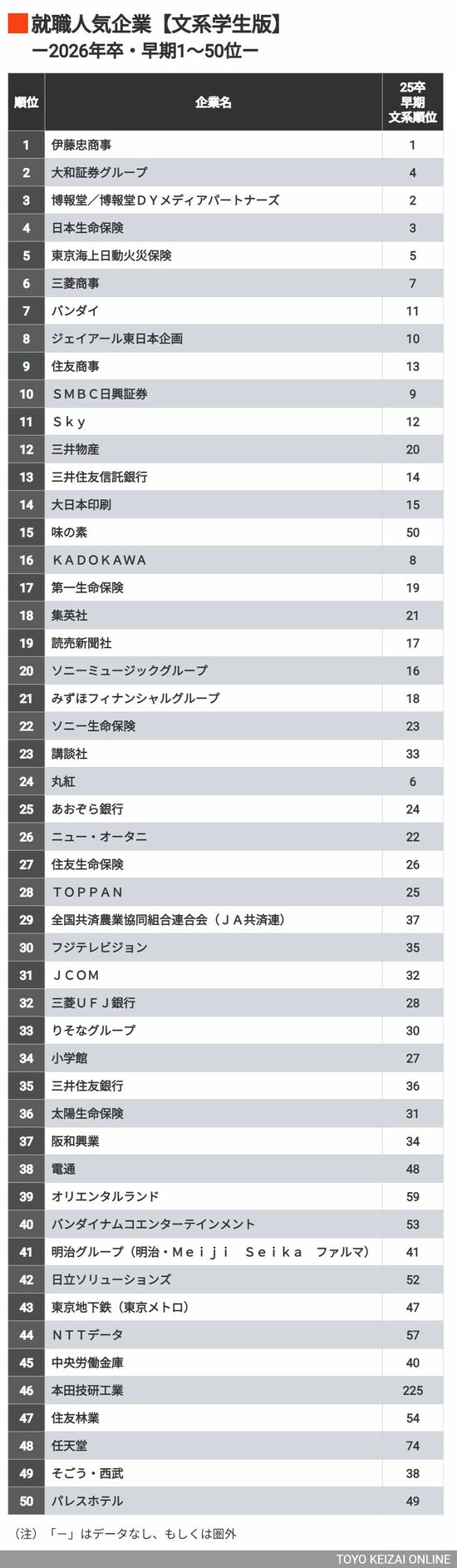 キャリア・教育 #就職四季報プラスワン 前の記事 次の記事 男子・女子学生が選んだ「就職人気ランキング」 「男子・女子・文系・理系」属性別の人気企業は? 3分で読める 公開日時:2024/12/09 05:30 東洋経済オンライン編集部 フォロー 1/9 PAGES 2/9 PAGES 3/9 PAGES 4/9 PAGES 5/9 PAGES 6/9 PAGES 文系1~50位 次ページが続きます 7/9 PAGES 8/9 PAGES 9/9 PAGES