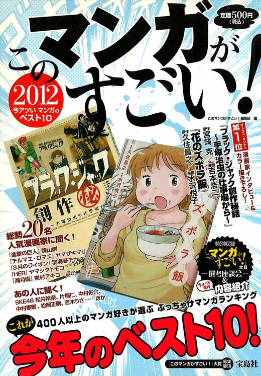 ところが、2012年版では[オトコ編]『ブラック・ジャック創作秘話』(作:宮﨑克・画:吉本浩二)、[オンナ編]『花のズボラ飯』(作:久住昌之・画:水沢悦子)が1位になった。前者は手塚治虫の仕事ぶりを関係者への取材をもとに綴ったドキュメンタリーで、後者は夫が単身赴任中の主婦のズボラで楽しい食卓を描いたグルメものだ。どちらも良作には違いないが、ややマニアックであり、描かれている世界は小さい。