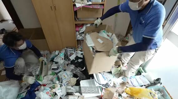 とくに多いのは紙ゴミだ。壁際には段ボール箱と衣装ケースが積み上げられ、部屋の真ん中にできたスペースに新聞、雑誌、チラシ、空き箱など、8年分のあらゆる紙ゴミが溜まっている。まるで、どこからか大量の紙を流し込まれたかのように、とにかく部屋中が紙ゴミであふれている。