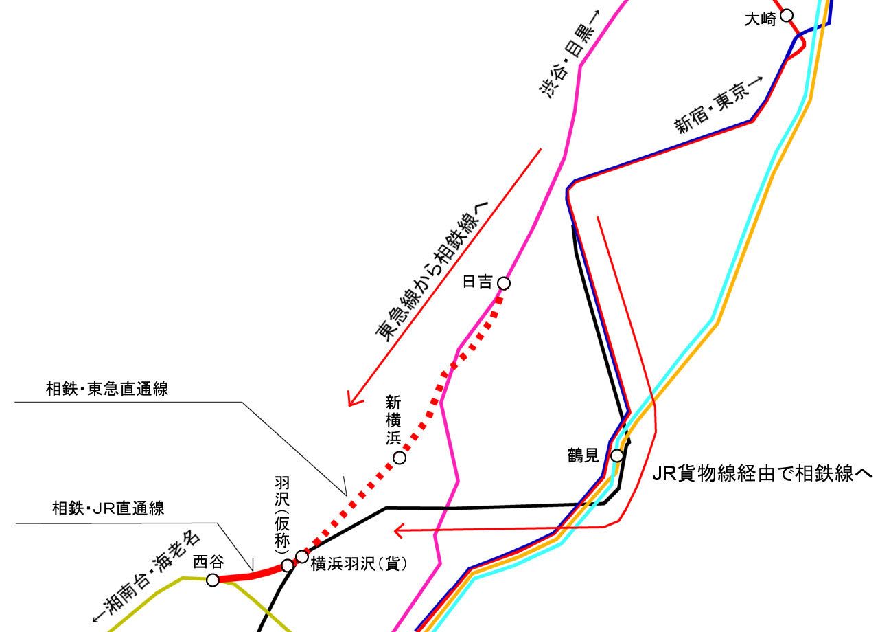 工事計画上は、横浜羽沢駅付近を境に西谷方の約2.7kmが「相鉄・JR直通線」、日吉方の約10.0kmが「相鉄・東急直通線」と呼ばれている。西谷駅で相模鉄道(相鉄)本線、横浜羽沢駅付近でJR東海道本線、日吉駅で東京急行電鉄(東急)東横線の線路にそれぞれ接続。相鉄線~JR線と相鉄線~東急線の相互直通運転が行われる。