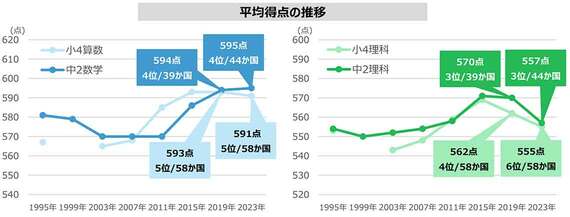2019年に実施された調査と比較すると、理科の平均得点は下がったものの算数・数学は前回並みだった。